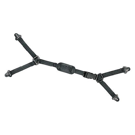 Längenverstellbarer Gabelkinnriemen aus Textil mit Drucktastenschnellverschluss, Kinnpolster und Befestigungsösen aus robustem Kunststoff